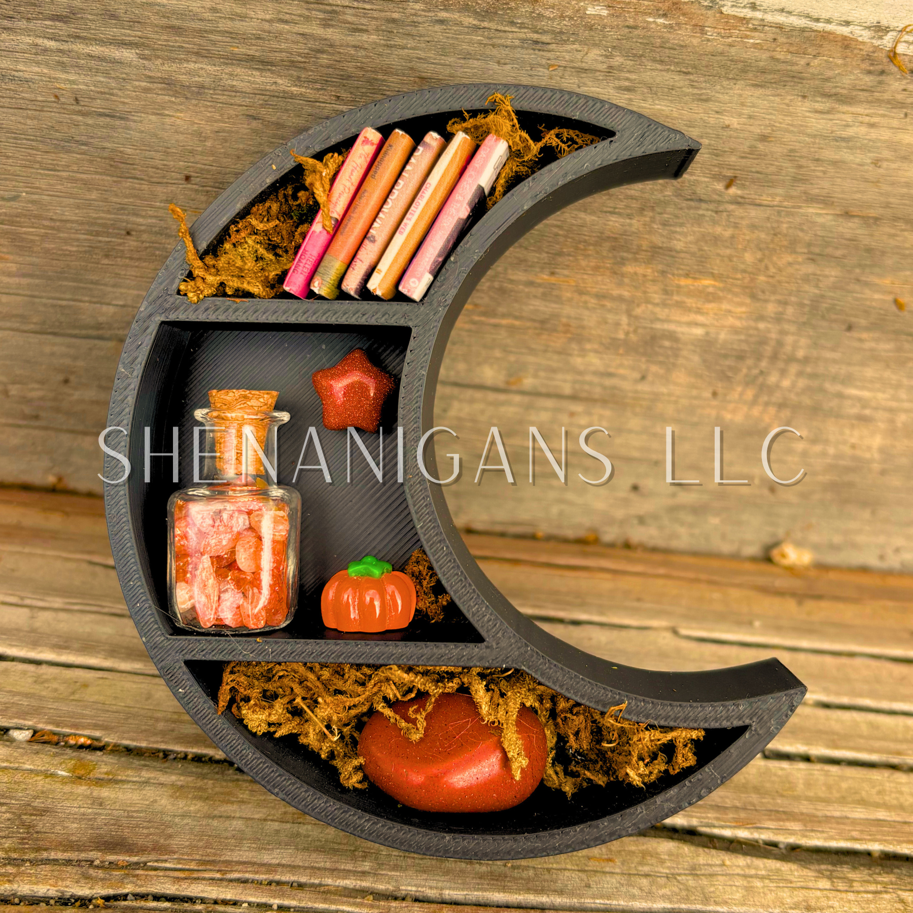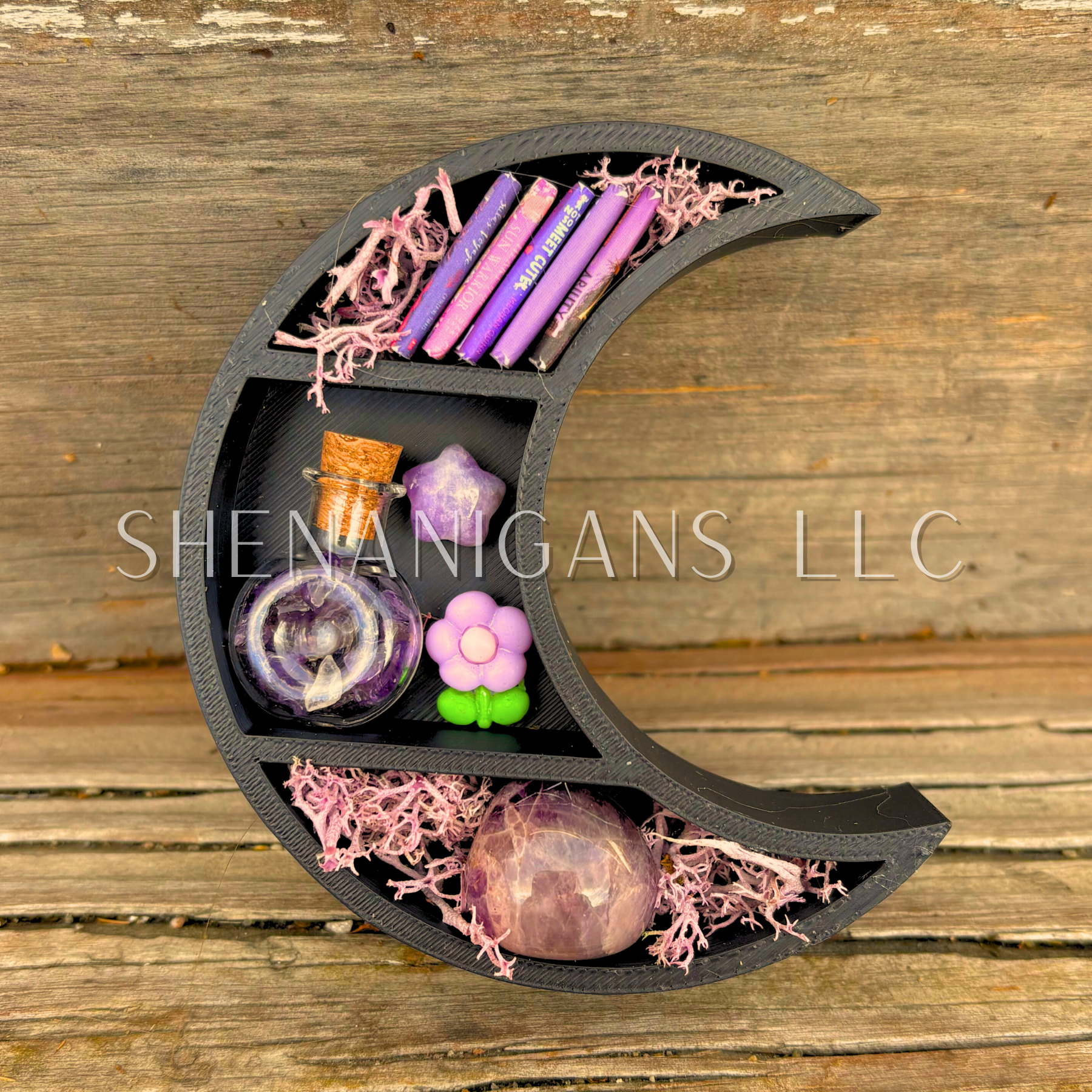 Mini Crescent Moon Crystal Shelf | 3D Printed Moon Display with Handpicked Crystals, Moss & Trinkets Magnet