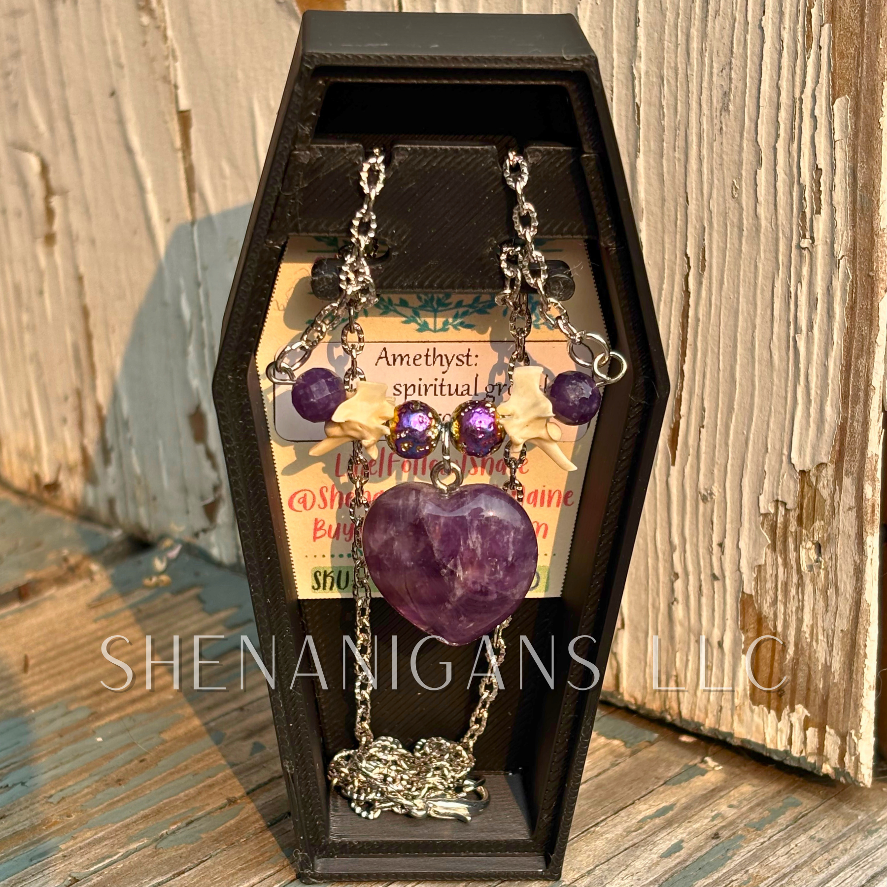 Amethyst Carved Heart Necklace with Rattlesnake Vertebrae