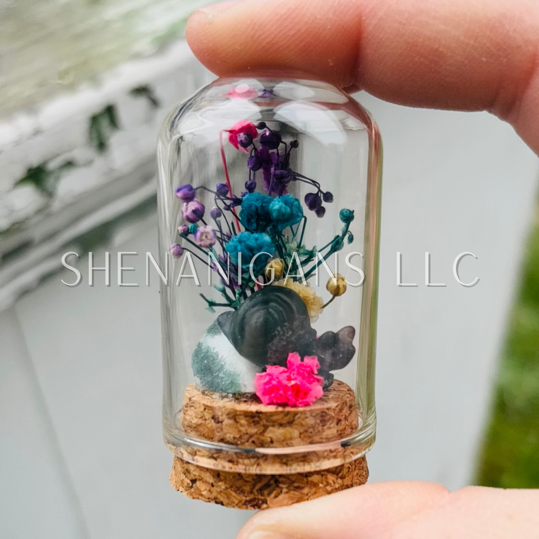 Bring a touch of magic to your space with this charming dome jar featuring gorgeous crystals and delicate preserved flowers. Perfect for adding whimsy to shelves, desks, or nightstands, this petite 2.25" treasure combines natural beauty with playful flair. Each jar is a one-of-a-kind display piece that celebrates the wonder of nature's finest gems and botanicals. A delightful gift for crystal lovers and plant enthusiasts alike!