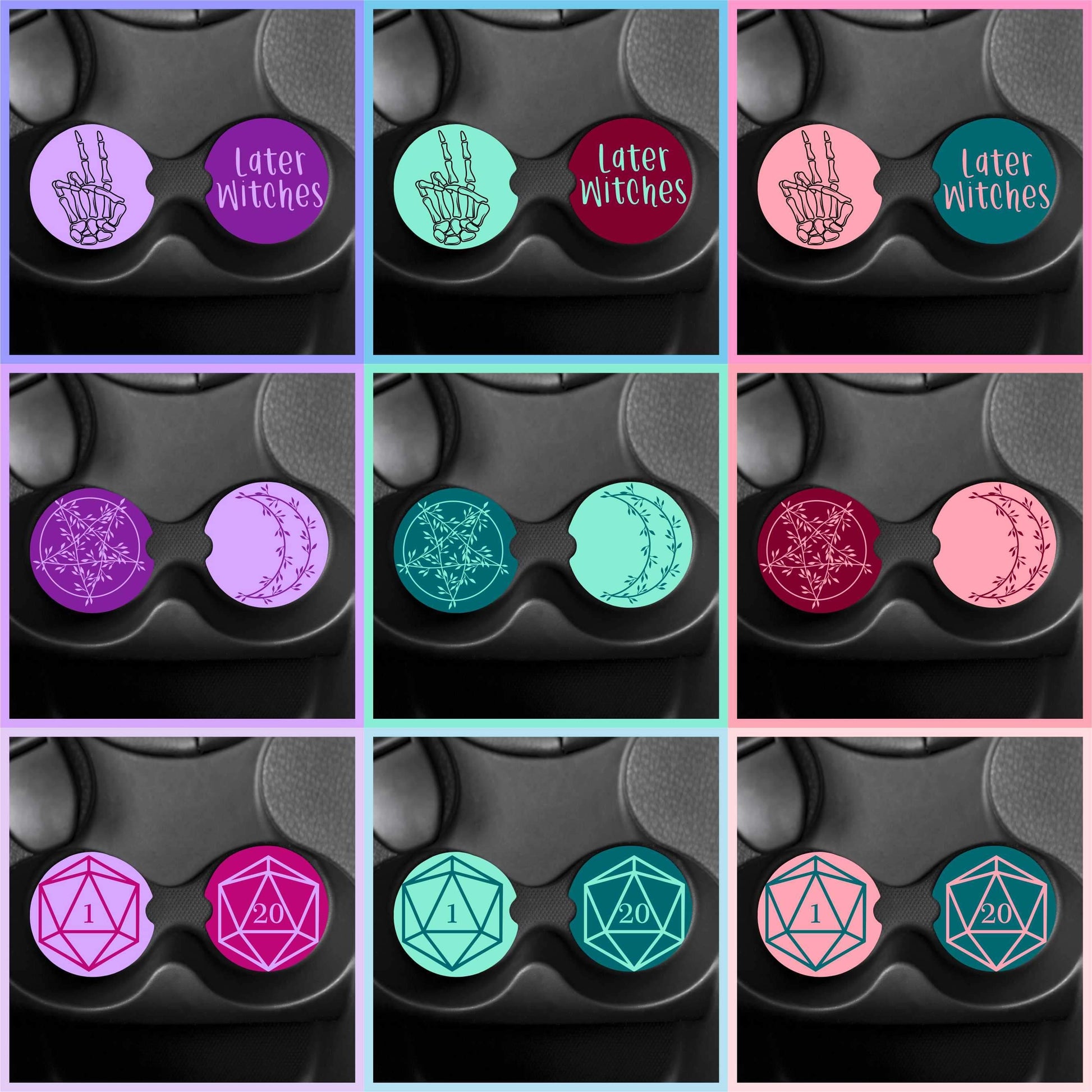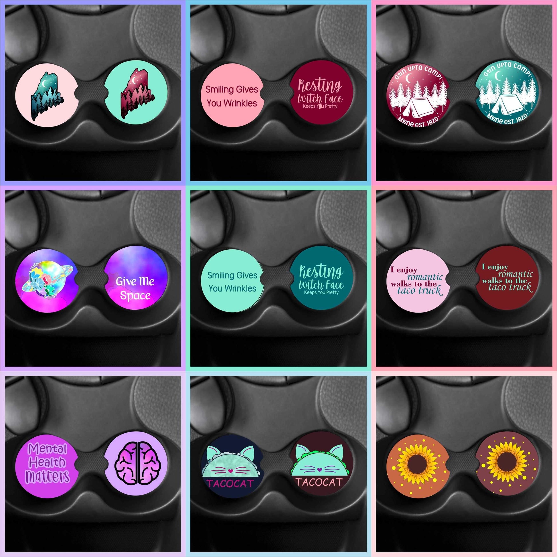 Make your car ride a little art-ier with these fun, original car coasters! Absorbent and stylish, each 2-piece set will protect your cup holder from condensation and make all your passengers smile. Drive in style!