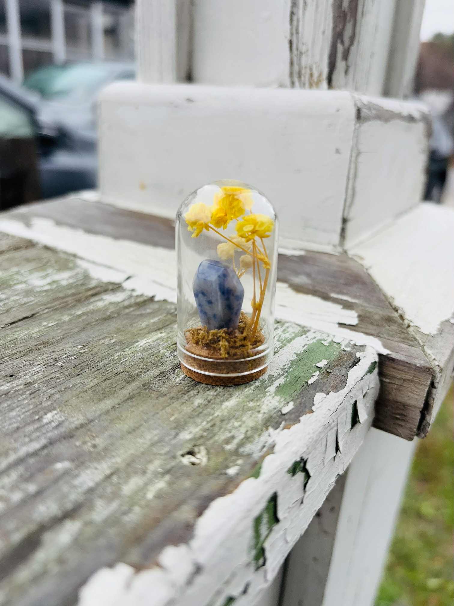 Bring a touch of magic to your space with this charming dome jar featuring gorgeous crystals and delicate preserved flowers. Perfect for adding whimsy to shelves, desks, or nightstands, this petite 2.25" treasure combines natural beauty with playful flair. Each jar is a one-of-a-kind display piece that celebrates the wonder of nature's finest gems and botanicals. A delightful gift for crystal lovers and plant enthusiasts alike!