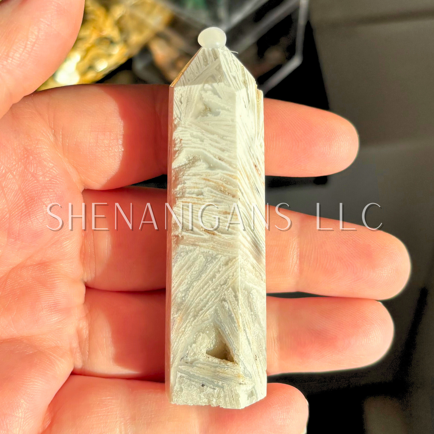Behold this stunning snow agate obelisk—a natural work of art that's equal parts geological marvel and conversation starter! With its mesmerizing white and gray patterns swirling across polished surfaces, this crystal wand brings a touch of winter magic to any space, year-round. Perfect for collectors, crystal enthusiasts, or anyone who appreciates the quirky beauty of Mother Nature's handiwork. Display it proudly on a shelf, desk, or altar, and let its cool, calming energy remind you that sometimes the most beautiful things come from a little chaos. A gem that's genuinely one-of-a-kind!