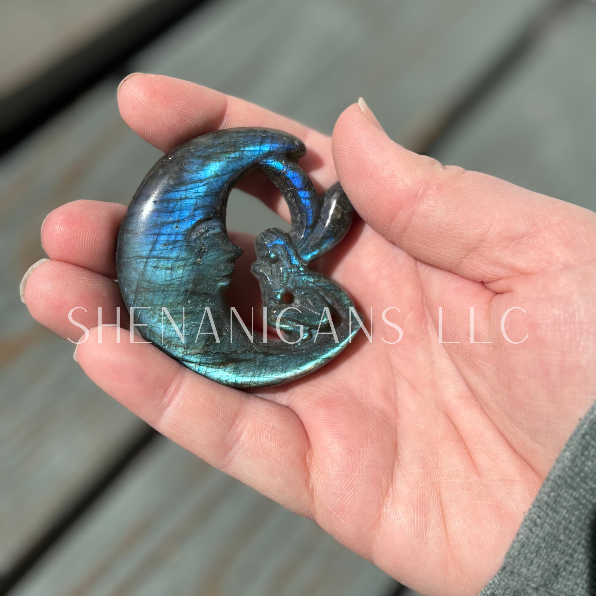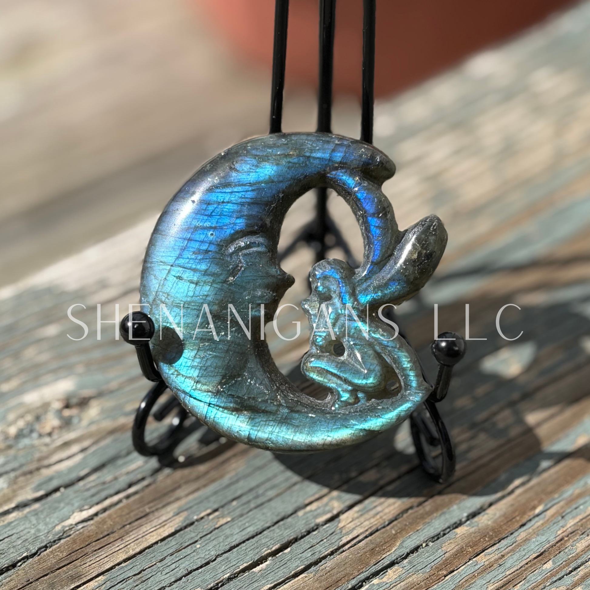 Fairy Kneeling on Crescent Moon - Labradorite - Crystal Carving