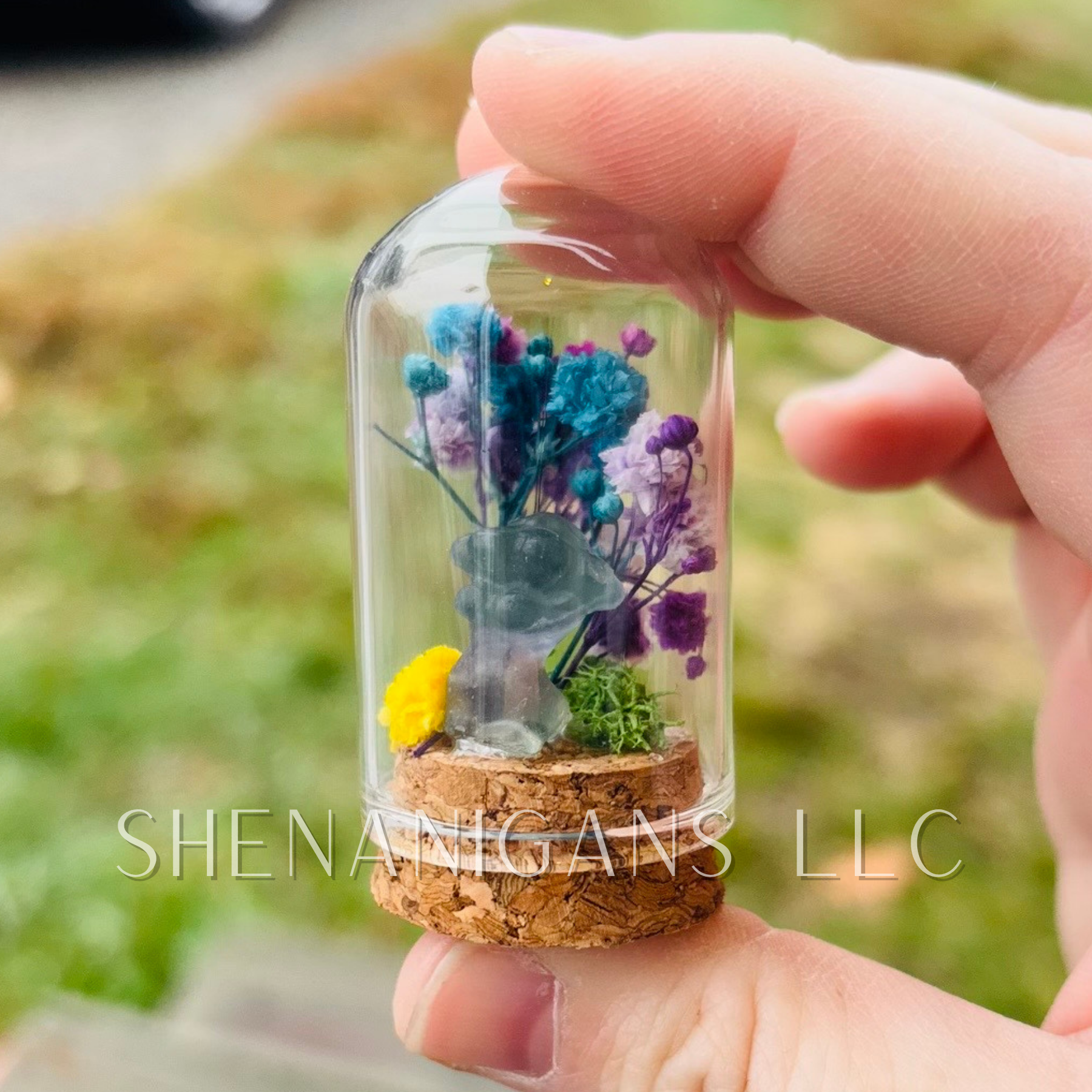 Bring a touch of magic to your space with this charming dome jar featuring gorgeous crystals and delicate preserved flowers. Perfect for adding whimsy to shelves, desks, or nightstands, this petite 2.25" treasure combines natural beauty with playful flair. Each jar is a one-of-a-kind display piece that celebrates the wonder of nature's finest gems and botanicals. A delightful gift for crystal lovers and plant enthusiasts alike!