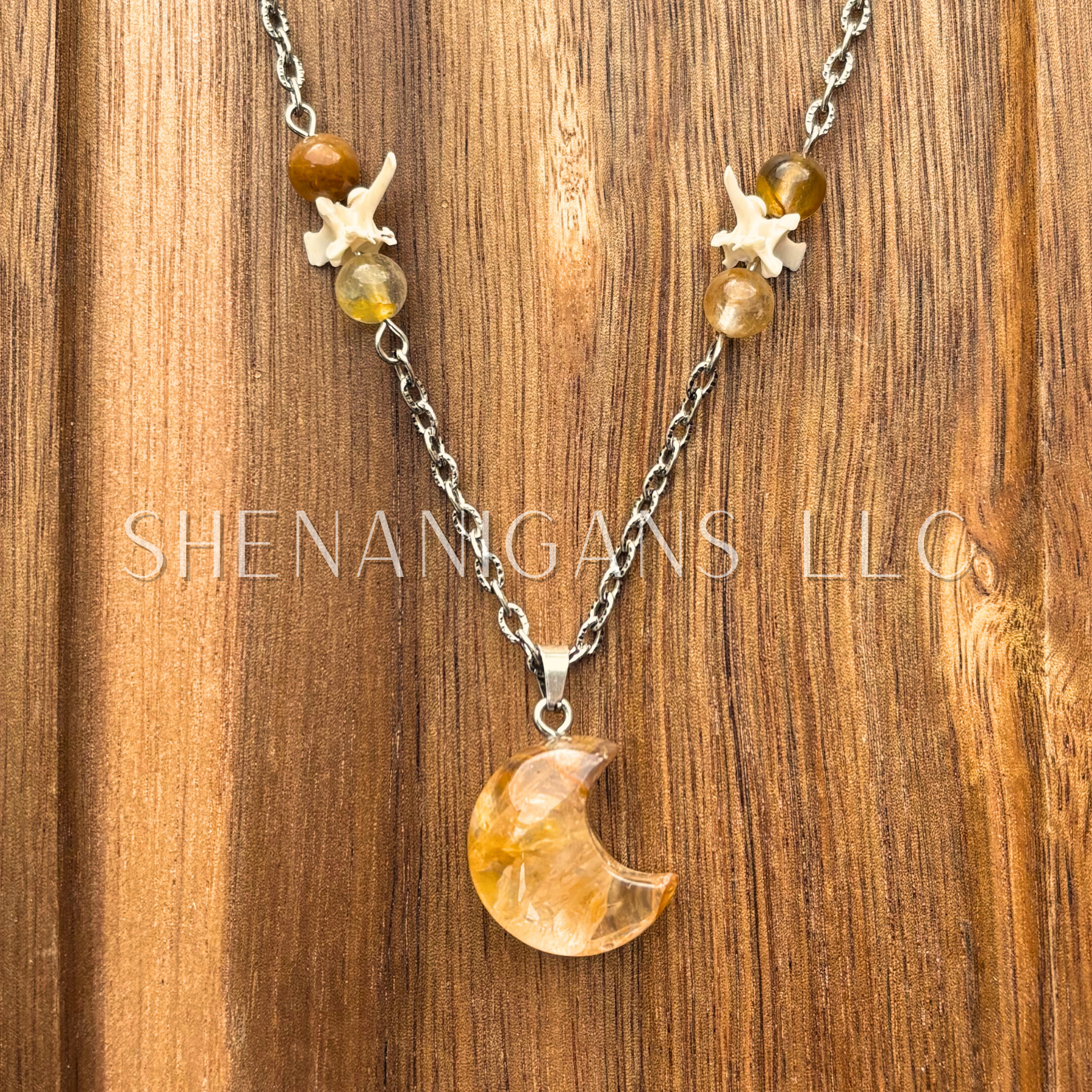 Golden Healer Crescent Moon Pendant – Beads & Rattlesnake Vertebrae Necklace