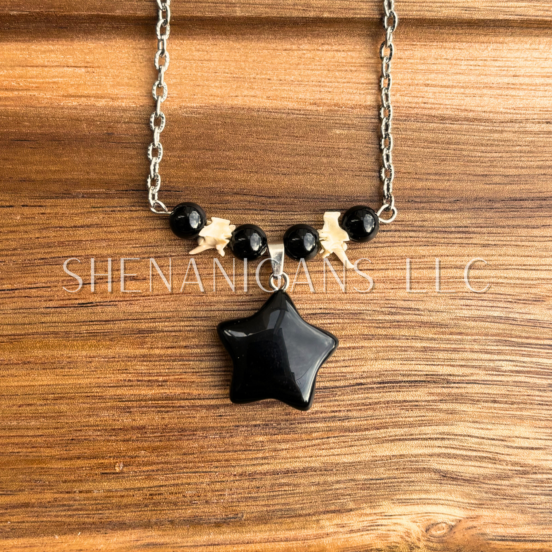 Obsidian Star Necklace – Crystal Carving with Rattlesnake Vertebrea