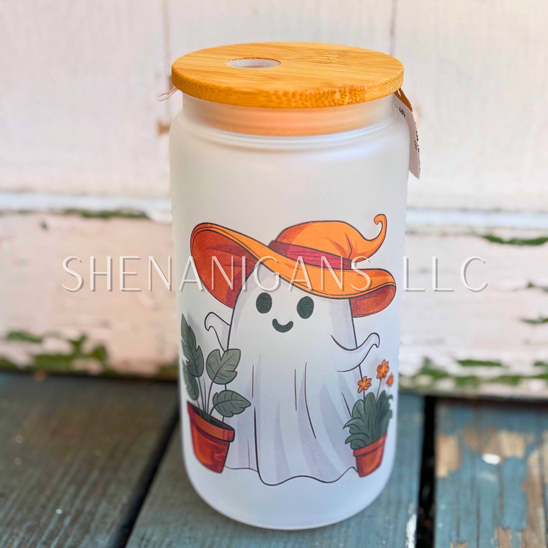 Plant Loving Ghostie Sun hat Glass Tumbler Bamboo Lid