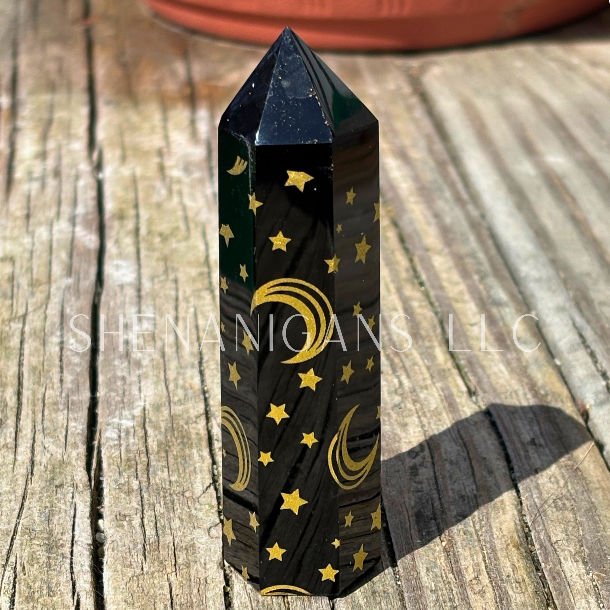 Printed Stars and Moon on Obsidian Polished Point Mineral Specimen Gemstone Crystal Obelisk Wand