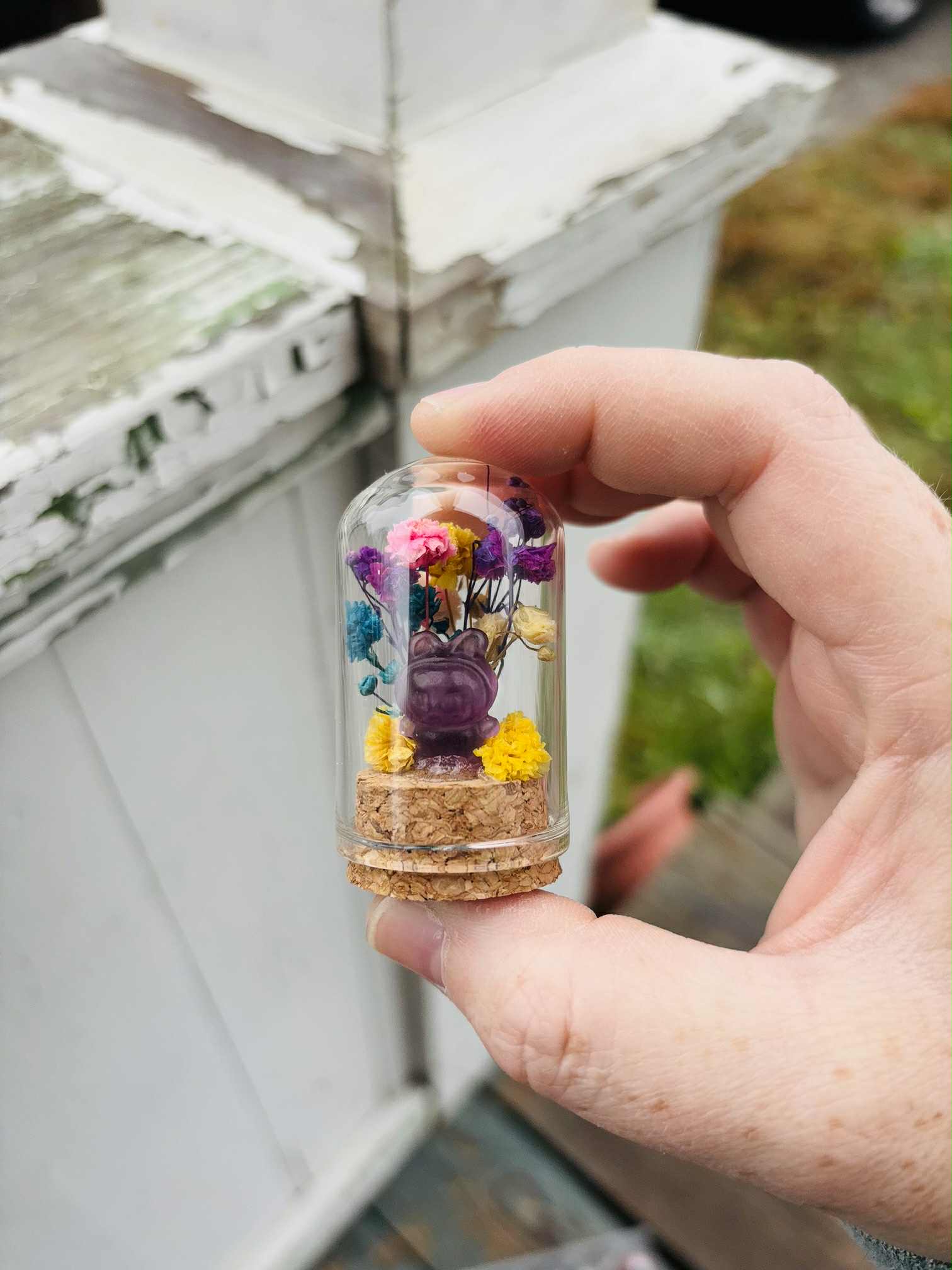 Bring a touch of magic to your space with this charming dome jar featuring gorgeous crystals and delicate preserved flowers. Perfect for adding whimsy to shelves, desks, or nightstands, this petite 2.25" treasure combines natural beauty with playful flair. Each jar is a one-of-a-kind display piece that celebrates the wonder of nature's finest gems and botanicals. A delightful gift for crystal lovers and plant enthusiasts alike!
