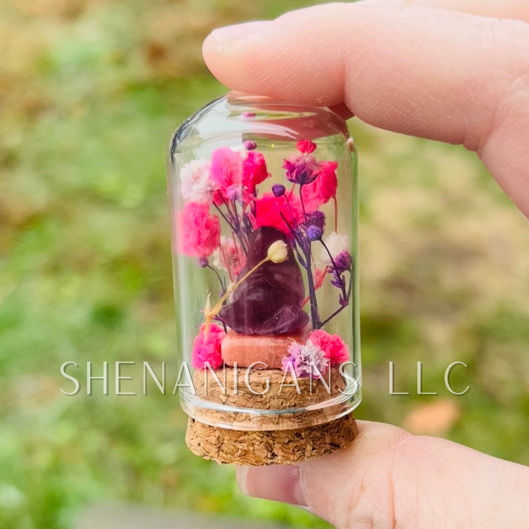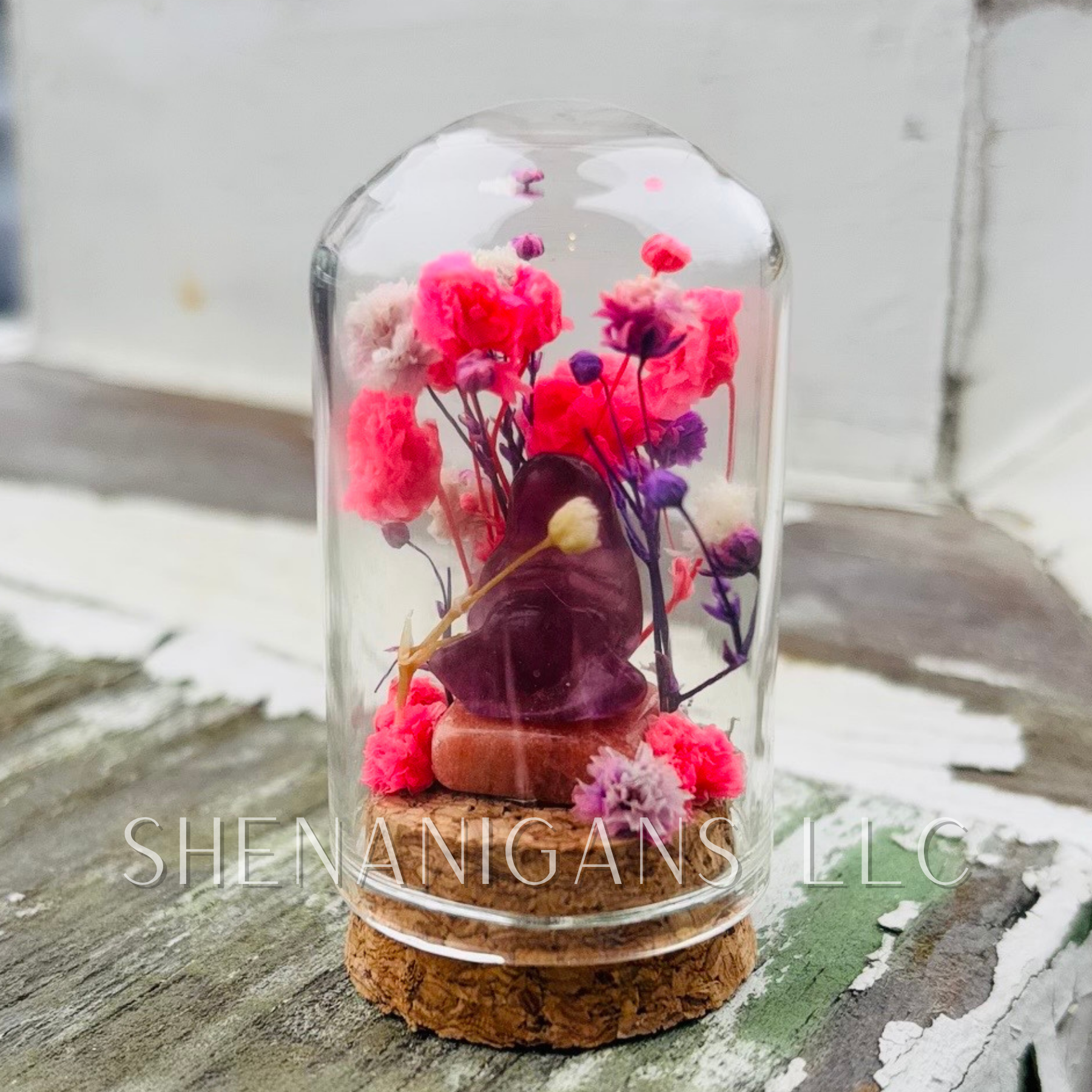 Bring a touch of magic to your space with this charming dome jar featuring gorgeous crystals and delicate preserved flowers. Perfect for adding whimsy to shelves, desks, or nightstands, this petite 2.25" treasure combines natural beauty with playful flair. Each jar is a one-of-a-kind display piece that celebrates the wonder of nature's finest gems and botanicals. A delightful gift for crystal lovers and plant enthusiasts alike!