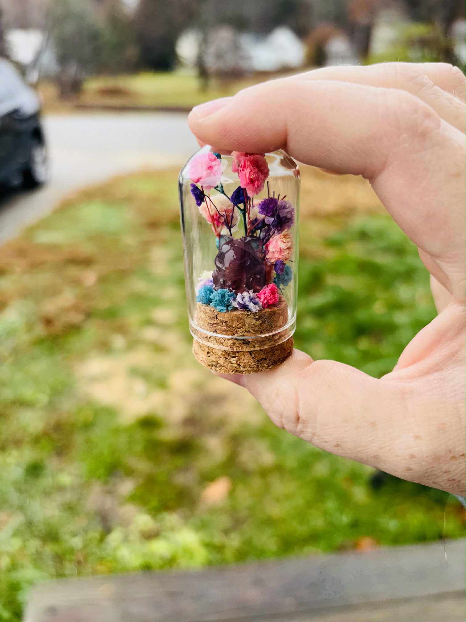 Bring a touch of magic to your space with this charming dome jar featuring gorgeous crystals and delicate preserved flowers. Perfect for adding whimsy to shelves, desks, or nightstands, this petite 2.25" treasure combines natural beauty with playful flair. Each jar is a one-of-a-kind display piece that celebrates the wonder of nature's finest gems and botanicals. A delightful gift for crystal lovers and plant enthusiasts alike!