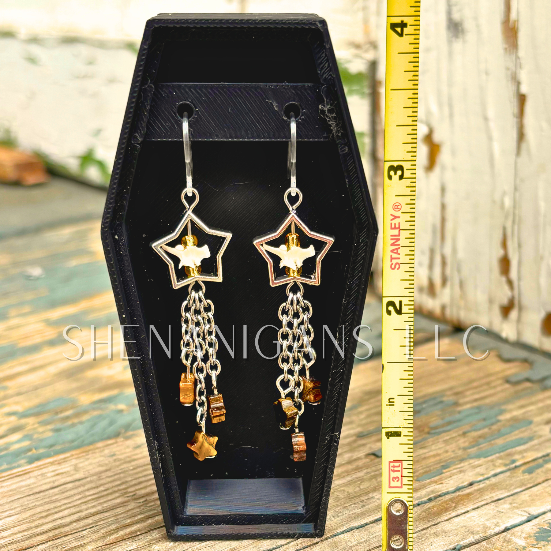 Shooting Star Earrings with Tiger’s Eye Stars & Rattlesnake Vertebrae – Handmade Celestial Coffin Display