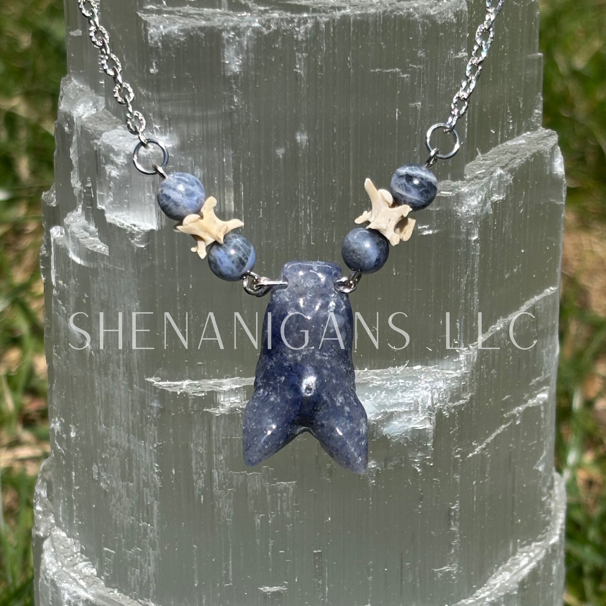 Hand-carved sodalite bat, sodalite beads, ethically sourced rattlesnake bone.