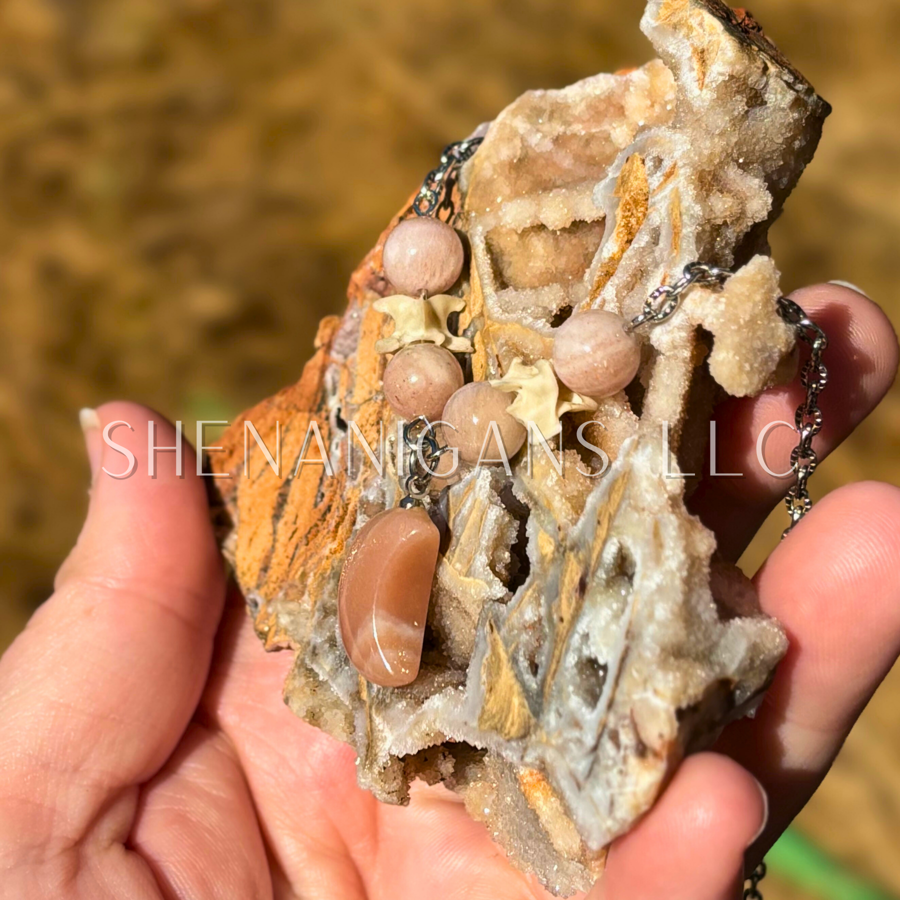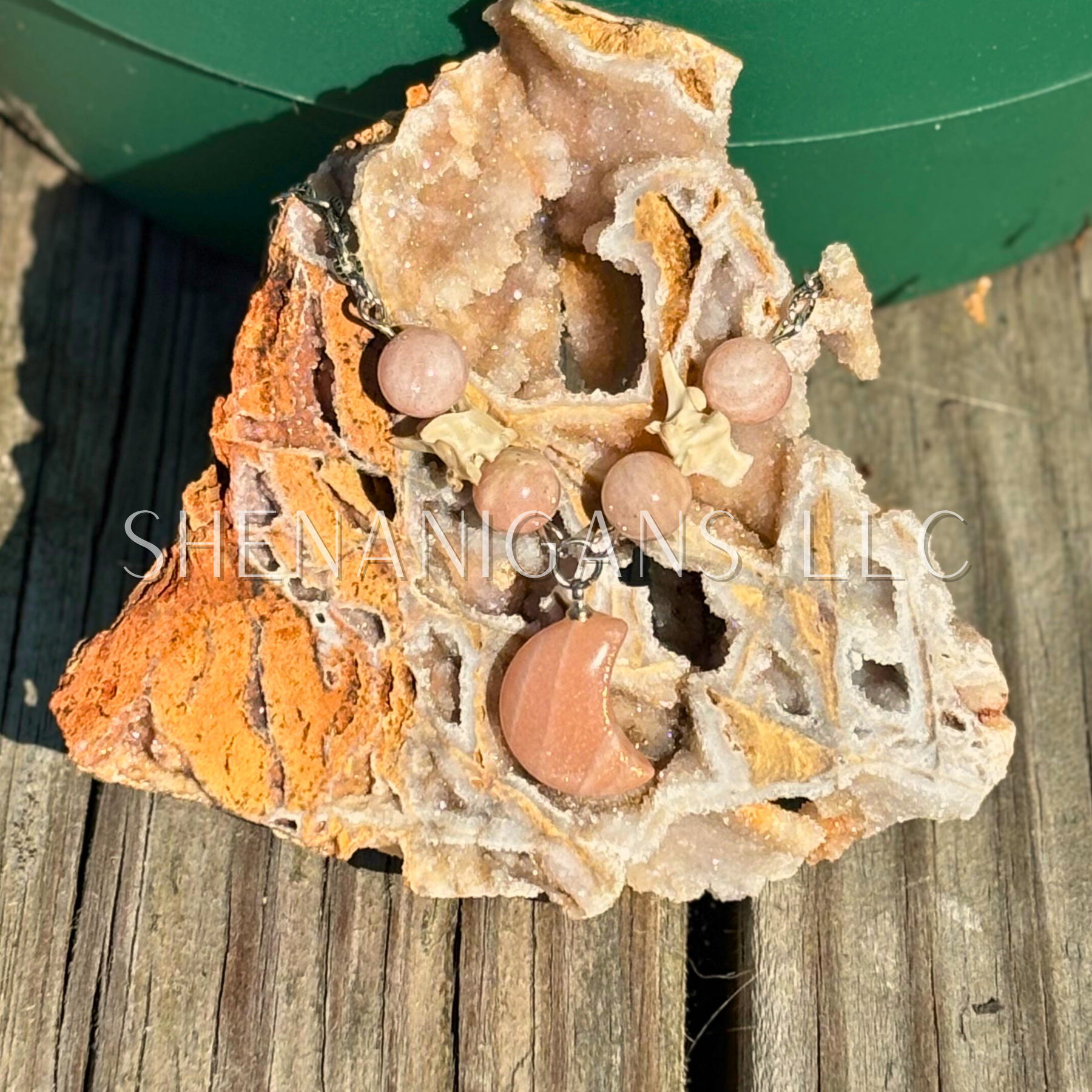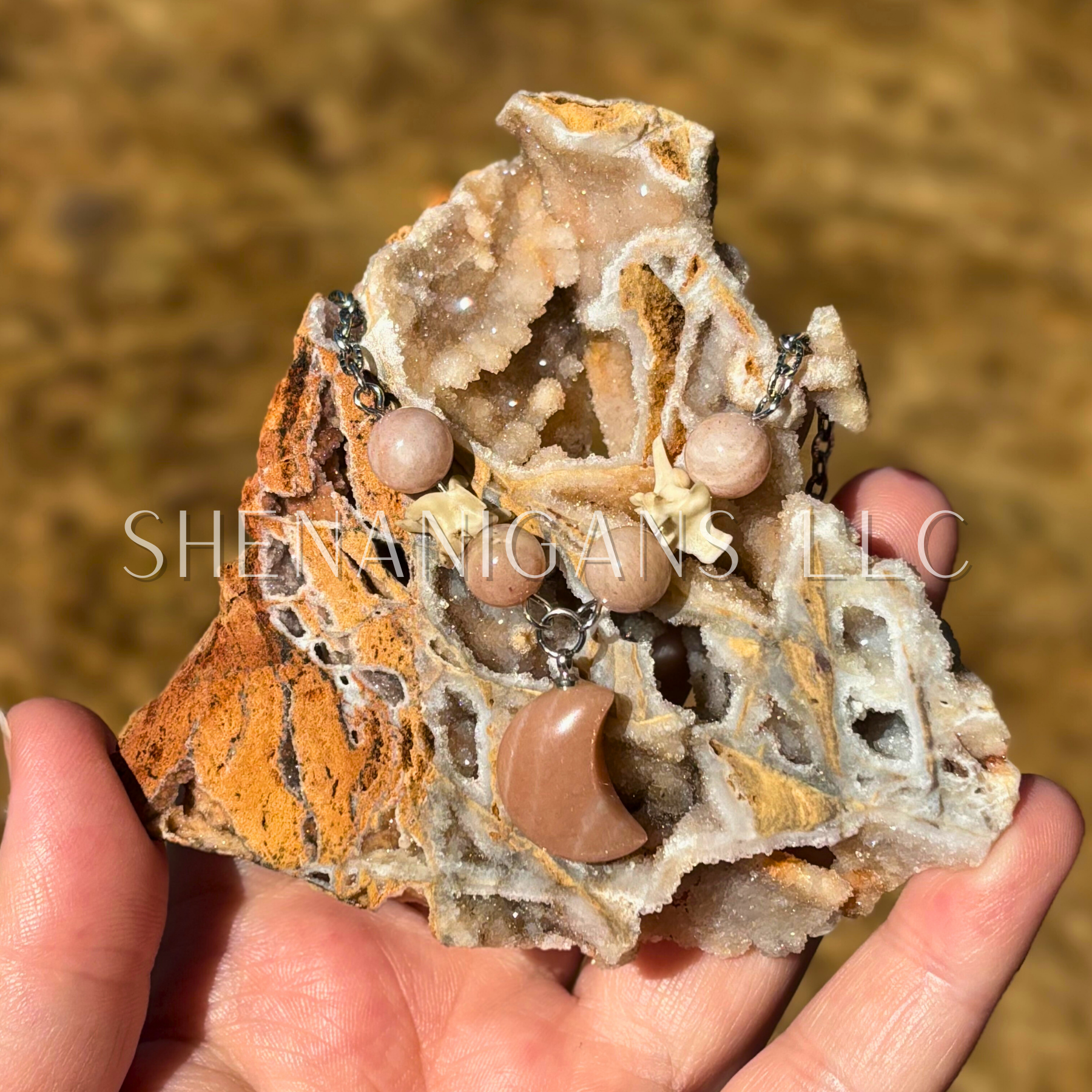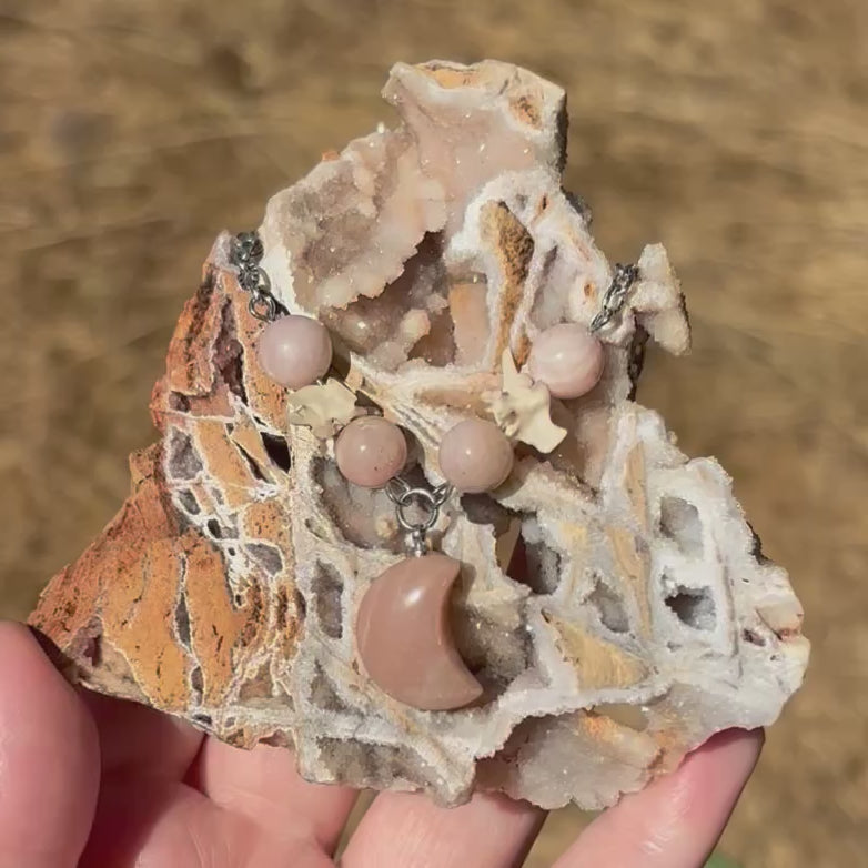 Sunstone Moon Necklace – Crystal Carving with Beads & Bone Detail
