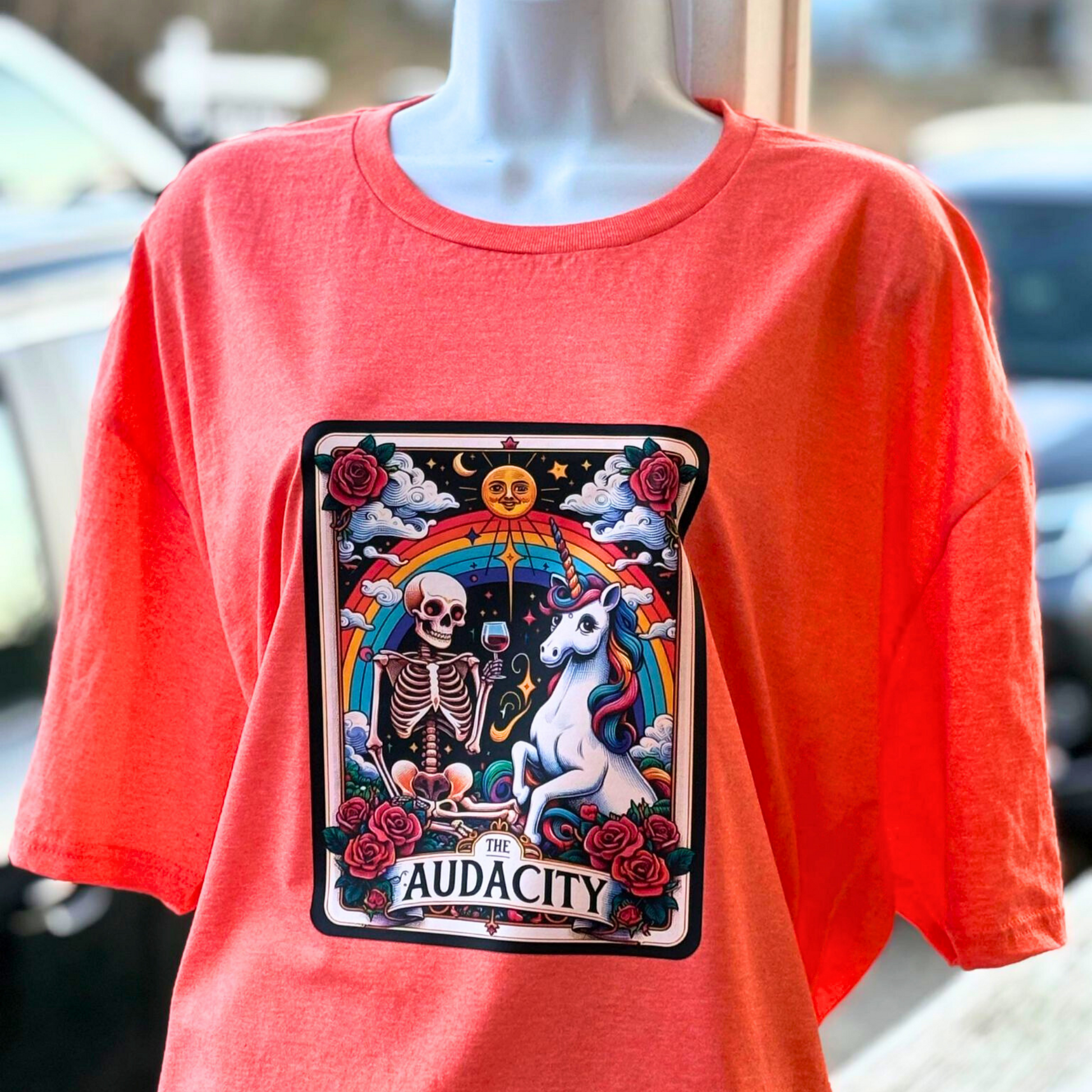 The Audacity Orange Tee Shirt, Unicorn, Skeleton, Rainbow, Space