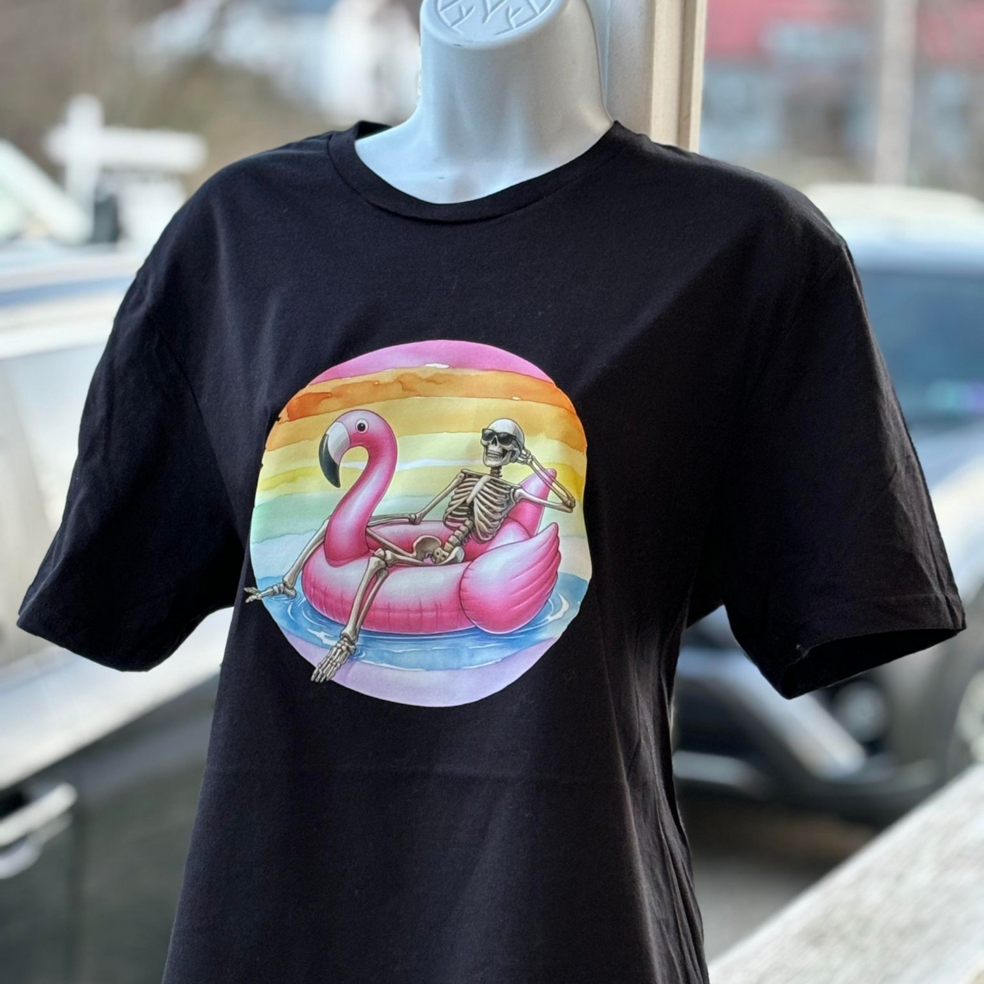 Vacation Skeleton Black Tee Shirt, Rainbow Pool Time, Flamingo Pool Toy
