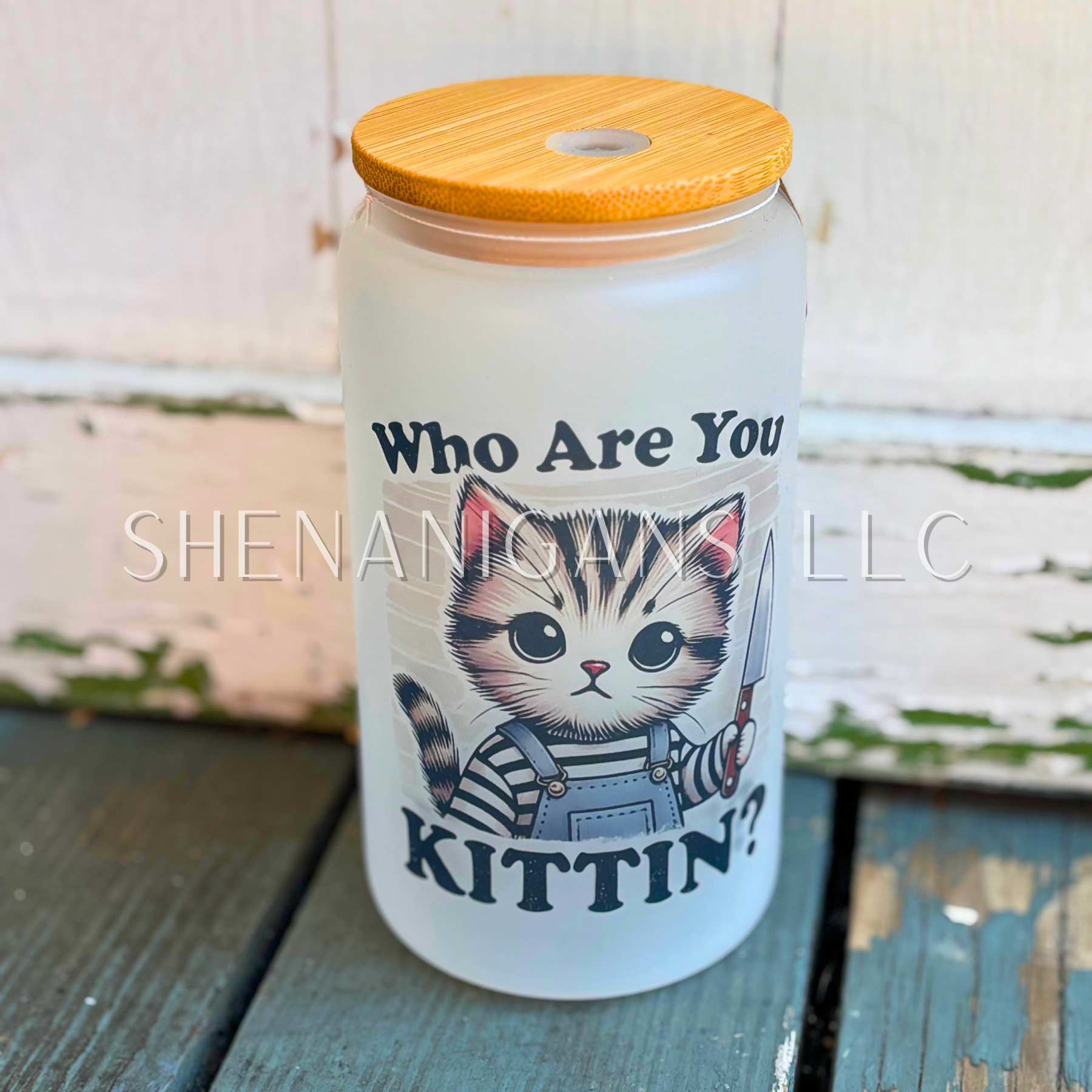 Who Are You Kitten? Glass Tumbler Bamboo Lid, Halloween Cat with Knife
