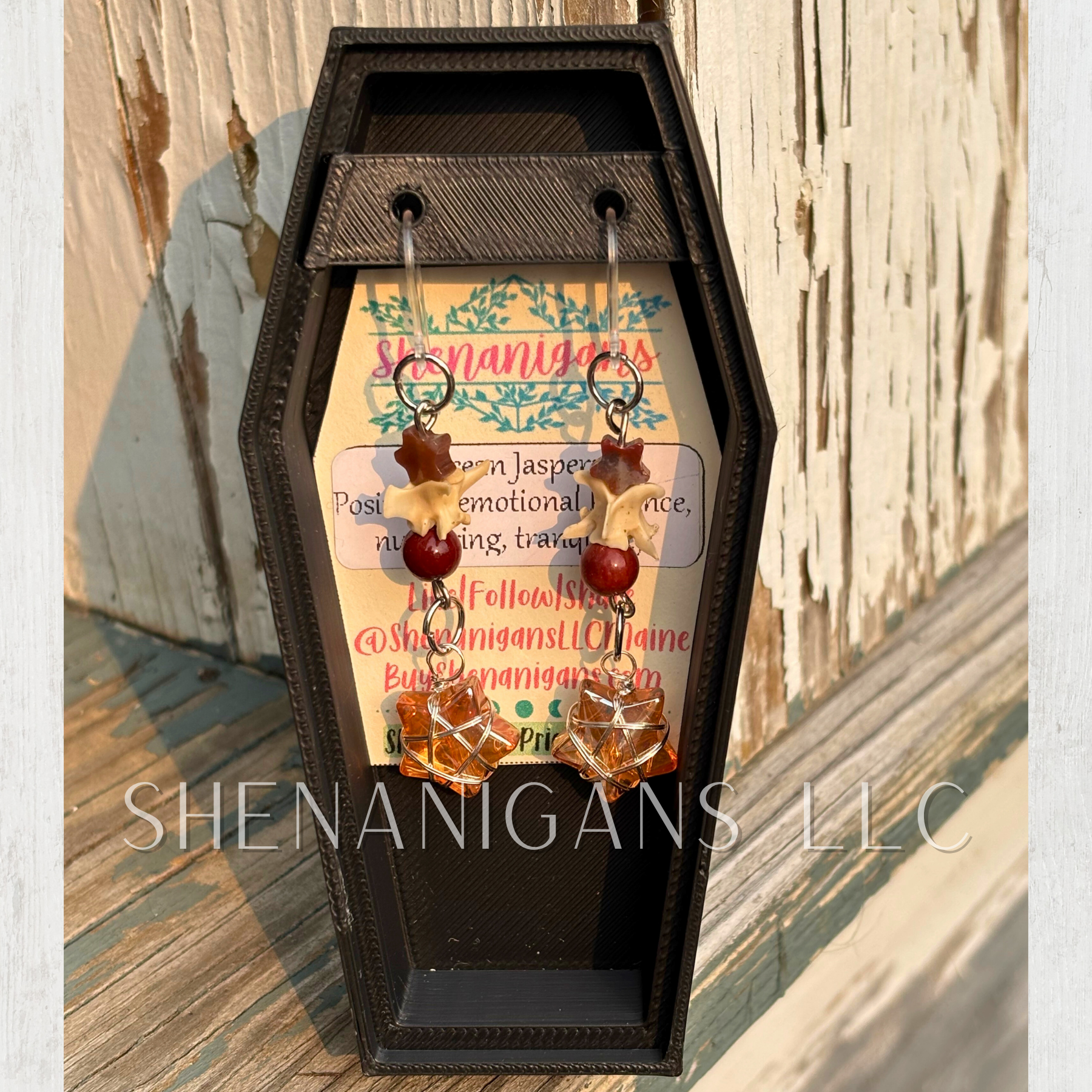 Celestial meets primal in these bold, handmade wire-wrapped star earrings. Featuring rich, earthy Forest Jasper beads, authentic rattlesnake vertebrae, and lightweight plastic fish hook ear wires, these earrings are a powerful fusion of earth, spirit, and shadow.