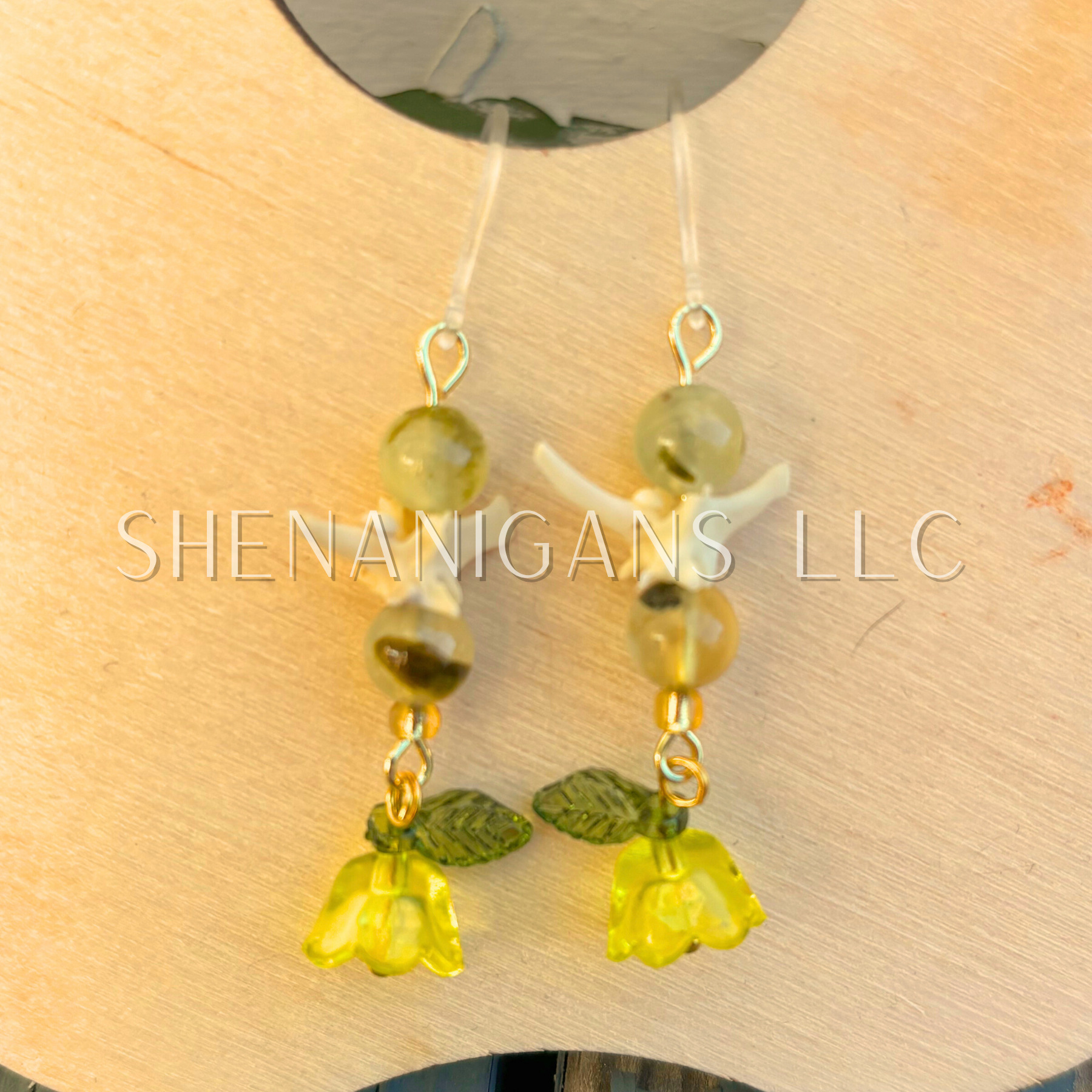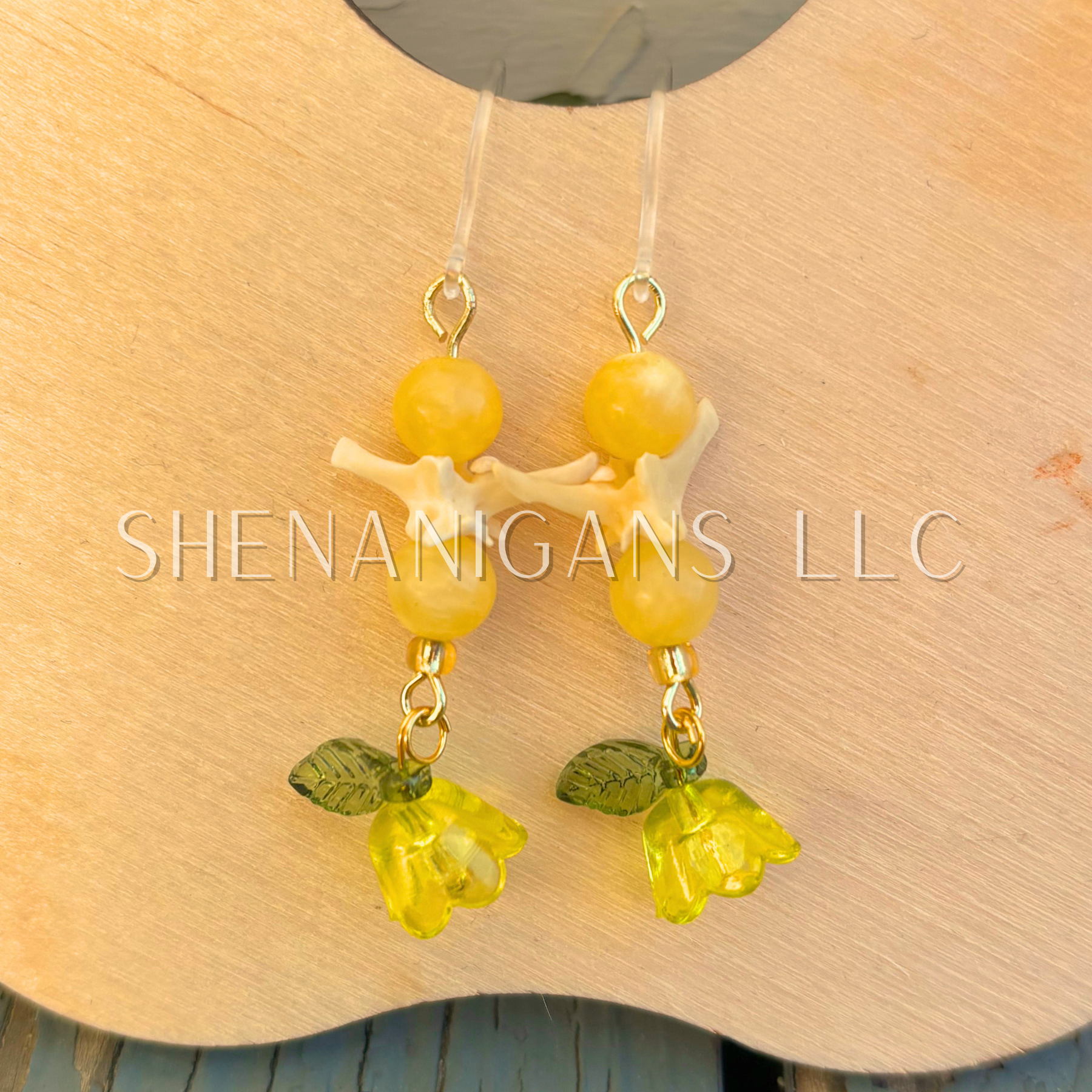 Yellow and Gold Bell Flower Dangle Earrings with Snake Vertebrae and Crystal Beads